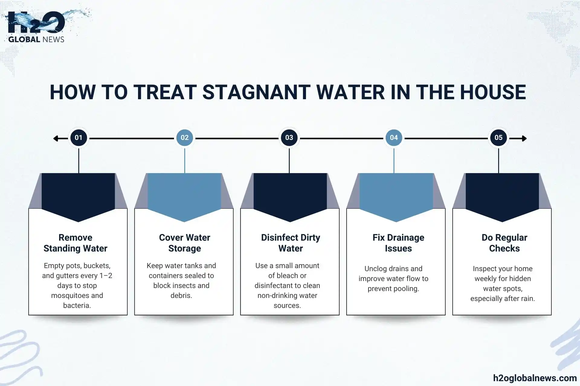Leaking pipes, blocked drains, uncovered buckets, and poor ventilation are common causes of stagnant water in the house. These spots allow water to collect and stay still.